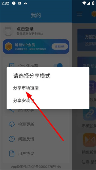 3、在弹出的请选择分享模式弹窗里,选择分享市场链接。