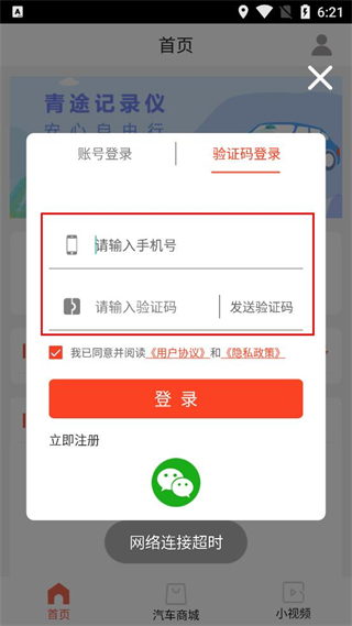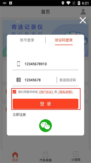 4、确认已勾选相关协议,点击登录按钮完成青途汽车应用的登录操作。