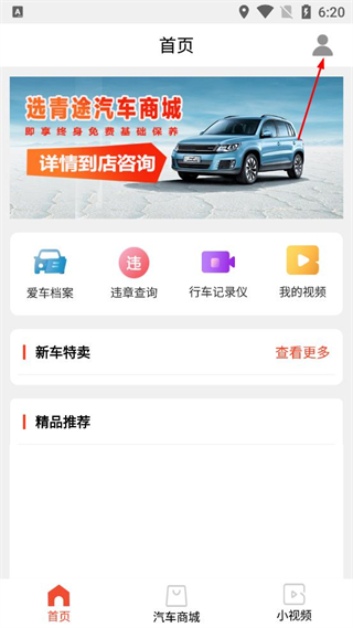 1、打开青途汽车应用,点击页面右上角的个人图标,弹出登录相关界面。