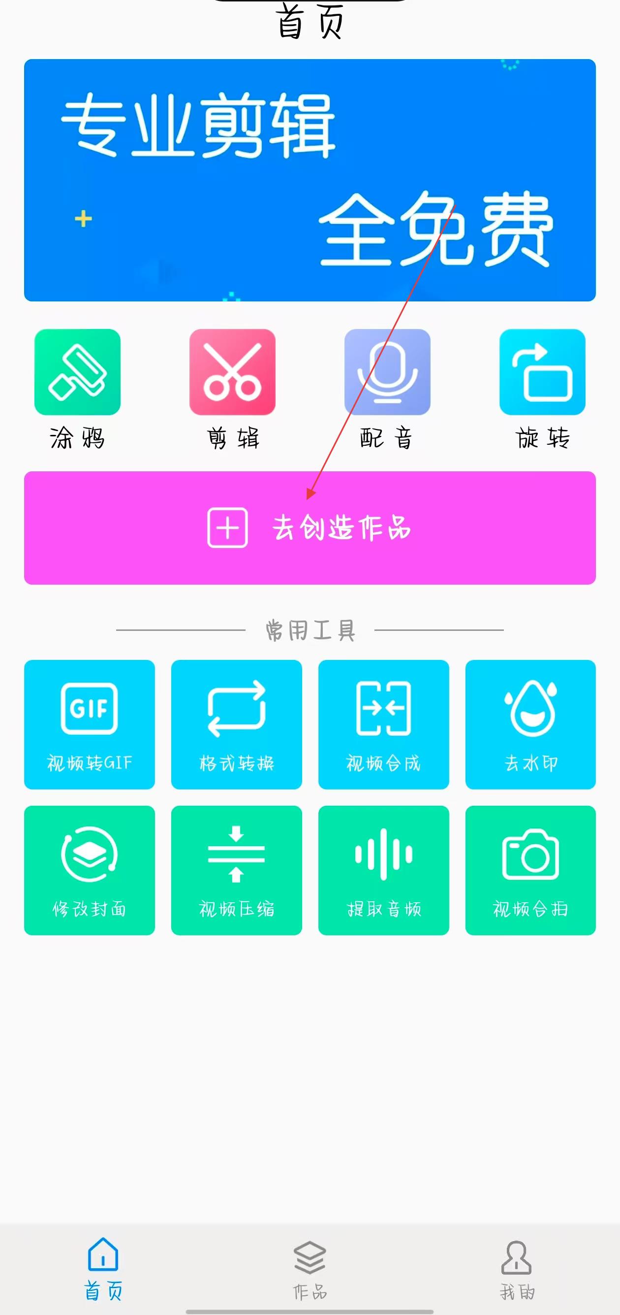 1、打开视频剪辑宝APP,在首页点击去创造作品按钮,进入视频选择界面。