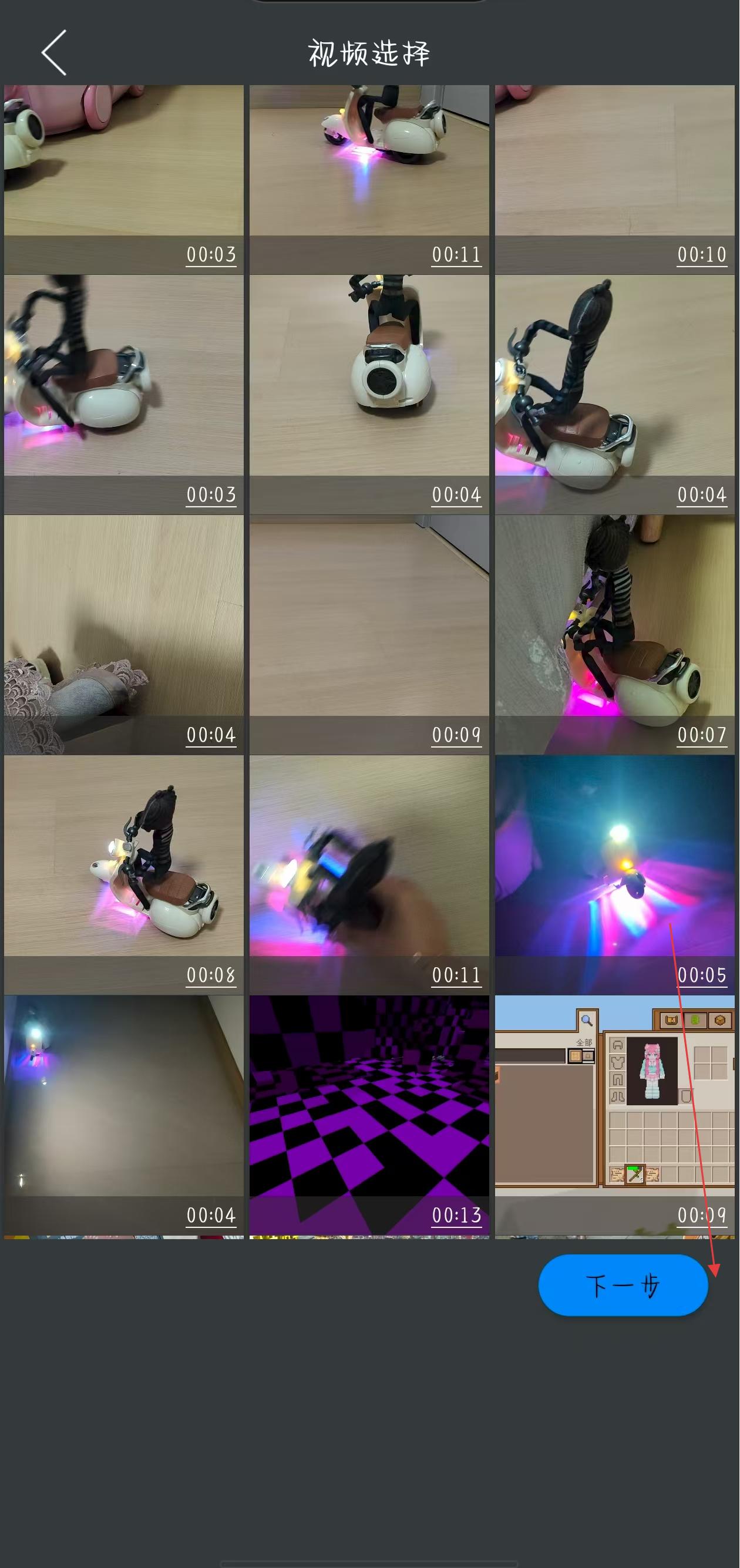 2、在视频选择界面,挑选需要剪辑的视频素材,选中后点击下一步。