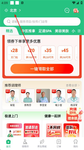 1、打开养生服务APP进入首页,在顶部导航栏找到中医推拿分类,点击进入该分类页面,可浏览对应调理师信息及相关服务项目,初步了解服务内容。