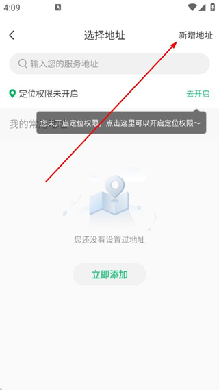 2、进入选择地址页面后,点击右上角的新增地址选项。