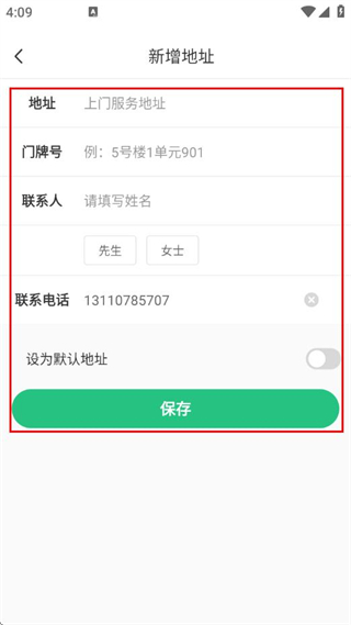 3、在新增地址页面,填写上门服务地址、门牌号、联系人等信息,完成后点击保存。