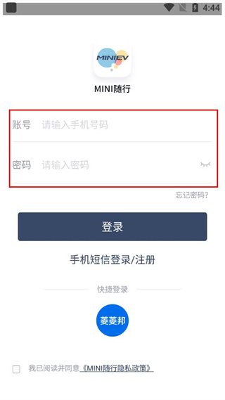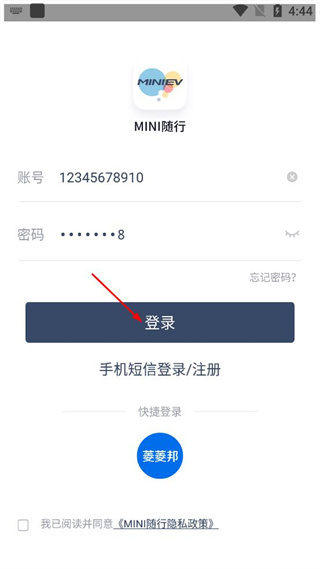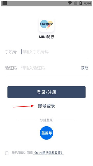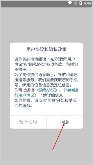 1、打开MINI随行,查看弹出的用户协议和隐私政策,点击同意按钮进入登录相关界面。