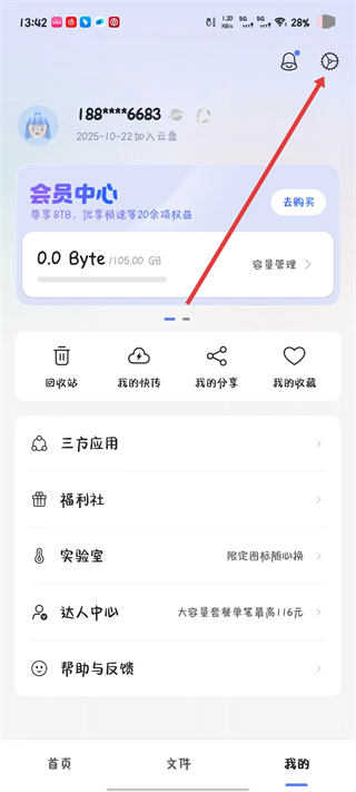 1、打开阿里云盘应用,点击右上角的设置图标。