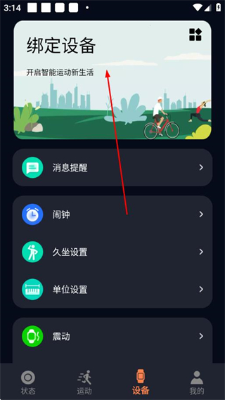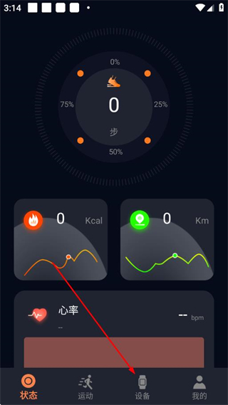 1、打开Cofit手表对应的APP,在状态页面点击底部导航栏的设备选项。