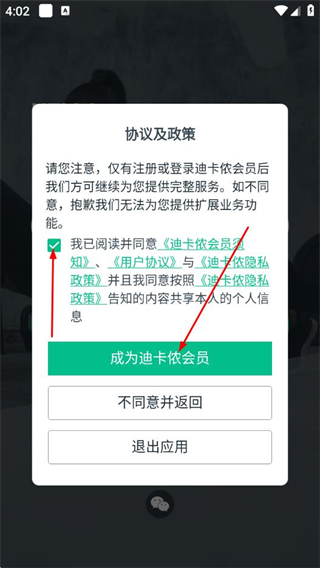 1、打开Econnected后,勾选我已阅读并同意相关条款,点击成为迪卡侬会员。