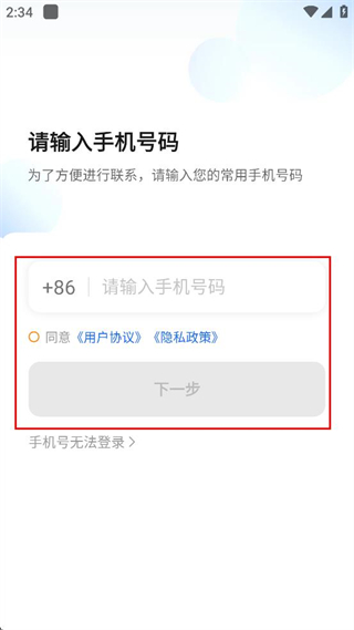 2、在请输入手机号码页面,填写常用手机号码,勾选同意用户协议隐私政策选项。
