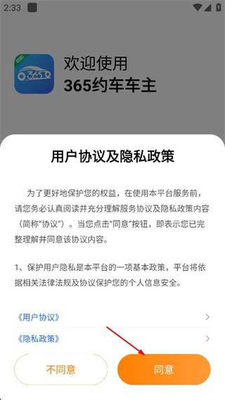 1、打开365约车车主,查看用户协议及隐私政策内容,点击同意按钮,进入手机号输入页面。