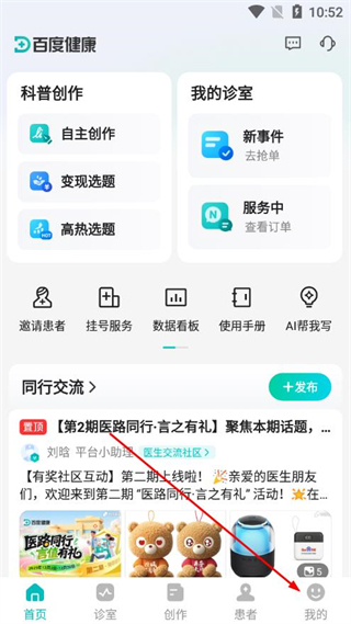1、打开百度健康医生版APP,在首页点击底部导航栏的我的选项。