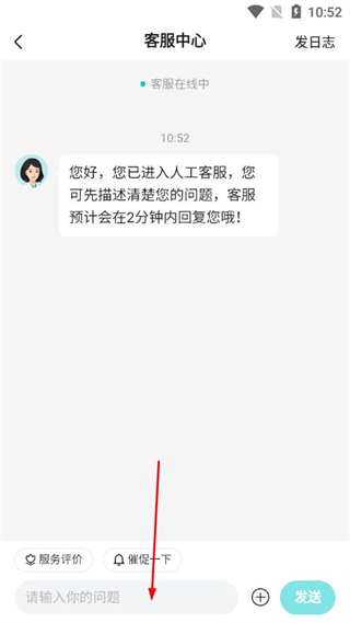 3、进入客服中心页面,在输入框填写问题后点击发送,即可联系客服。