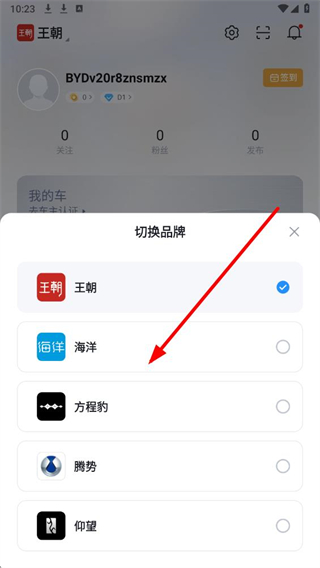 2、进入选择车辆品牌页面后,在王朝、海洋方、程豹、腾势等车辆品牌选项中,点击王朝选项。