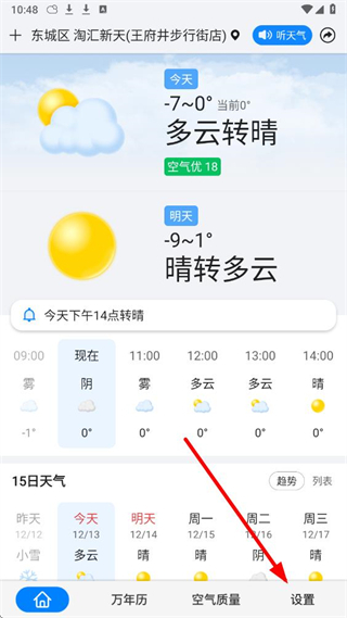 1、打开准点天气app,点击底部的设置选项,进入设置页面。