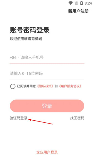 2、进入新用户注册页面,找到页面下方的验证码登录选项,点击该选项。