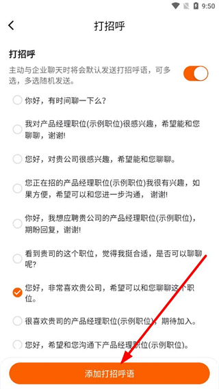 4、在该页面可开启打招功能,勾选预设的招呼语,或点击添加打招唿语自定义内容,完成打招呼设置。