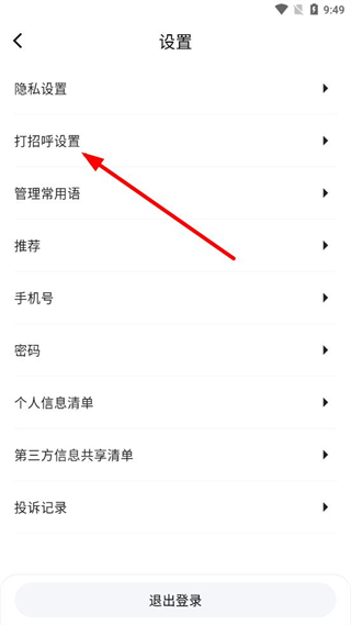 3、在设置界面里,选择打招呼设置选项,进入打招呼配置页面。