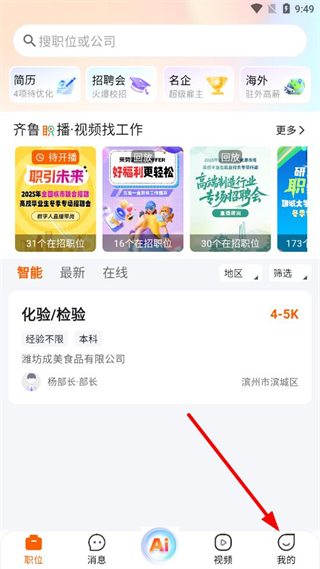 1、打开齐鲁人才APP,点击底部导航栏中的我的。