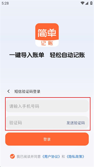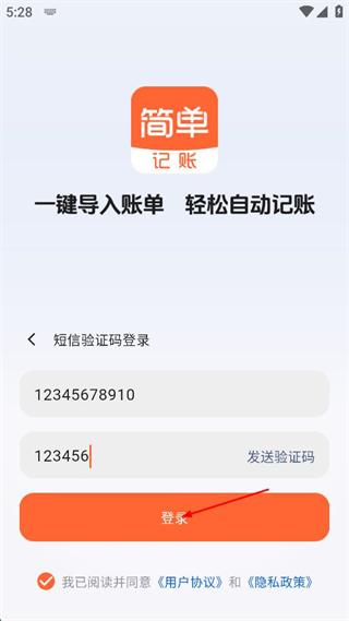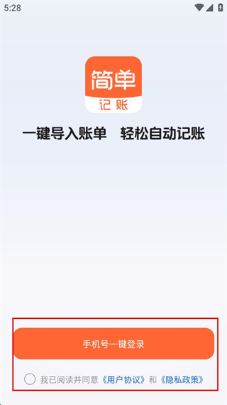 1、打开简单记账应用,在初始页面勾选相关协议,点击手机号一键登录选项。