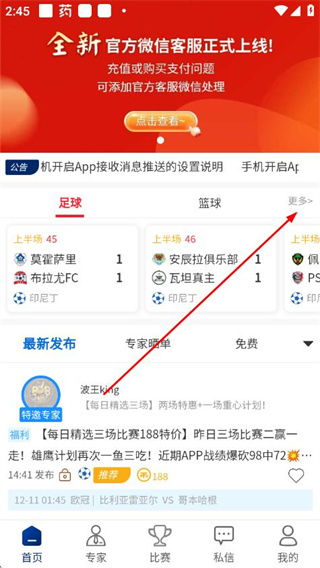 1、打开球进了app的首页,点击足球板块右侧的更多,进入赛事列表页面。
