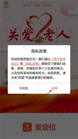 1、打开爱定位应用,阅读弹出的隐私政策内容,点击同意按钮进入登录相关页面。
