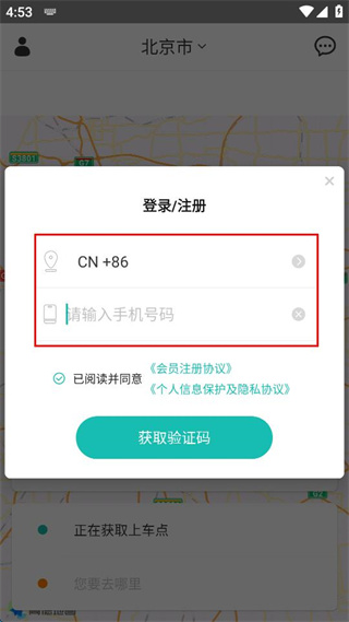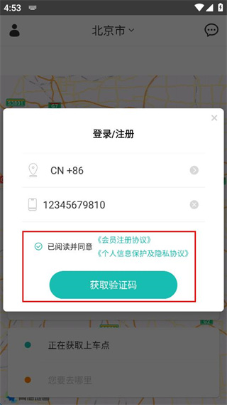 4、确认已勾选相关协议选项,点击窗口中的获取验证码按钮来获取验证信息。