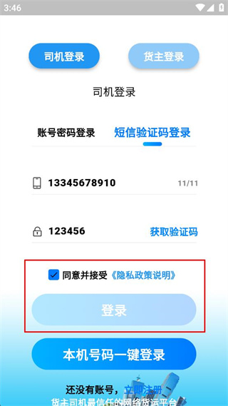4、输入收到的验证码,勾选同意并接受隐私政策说明,点击登录按钮完成操作。