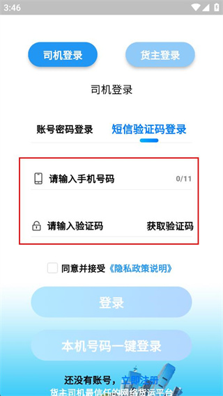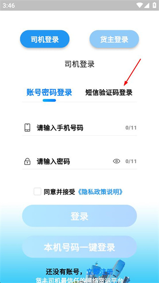 2、在登录页面选择司机登录选项,点击短信验证码登录切换至对应登录方式。