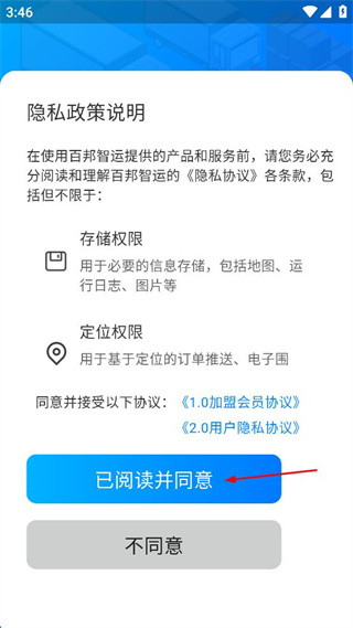 1、打开百邦智运应用,在隐私政策说明窗口,点击已阅读并同意按钮进入登录页面。