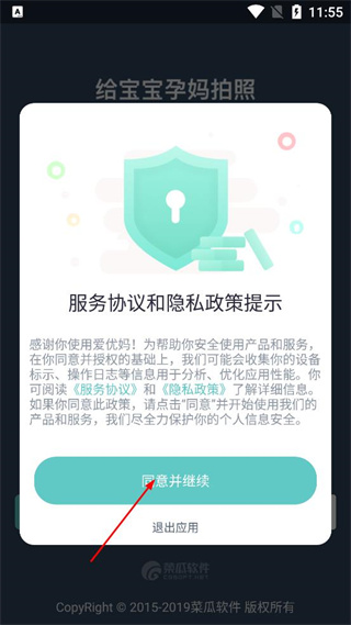 1、打开爱优妈拍照服务APP,查看弹出的服务协议和隐私政策提示,点击同意并继续按钮进入应用。