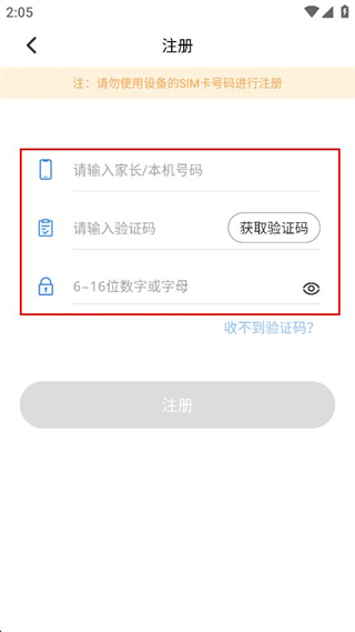 2、在注册页面依次填写家长/本机手机号码,点击获取验证码后填写验证码,设置6-16位数字或字母的密码,完成信息填写。