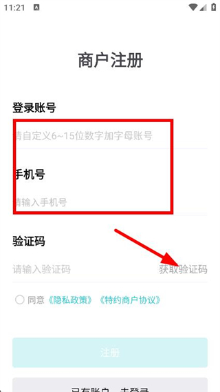 2、在输入框填写登录账号和手机号,并获取短信验证码。