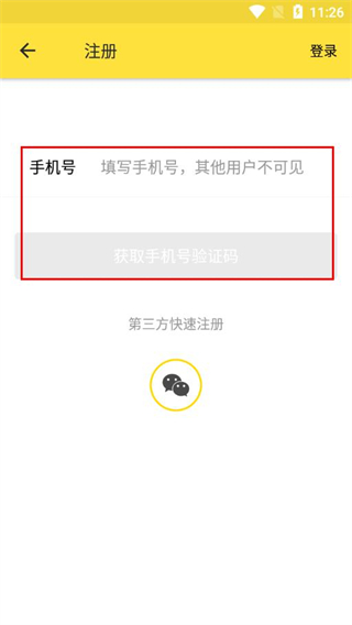 3、在注册页面填写手机号码,点击获取手机号验证码并填写。