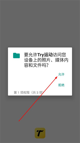 1、打开Try运动app后,在弹出的权限请求弹窗中点击允许。