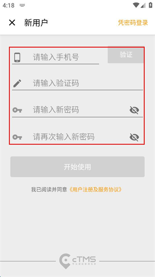 1、打开CTMS软件,找到新用户注册选项并点击,进入新用户注册页面后,在请输入手机号栏填写手机号,然后点击验证按钮。