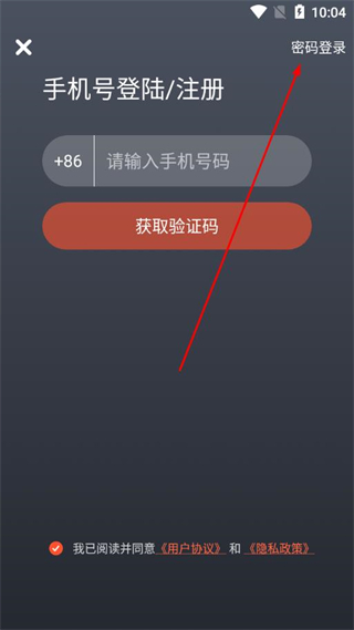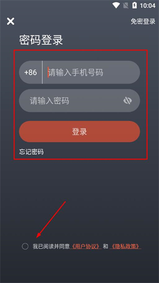3、输入手机号码和密码,勾选用户协议后点击登录。