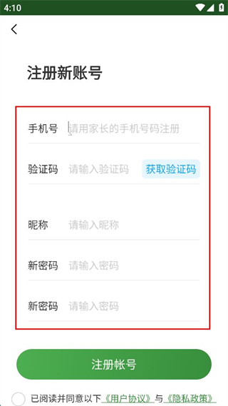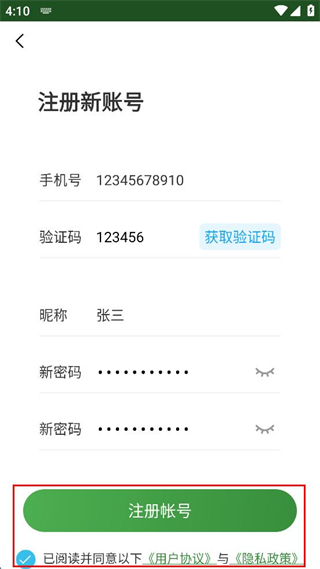 3、在注册新帐号界面,依次填写手机号、验证码、昵称及两次新密码。