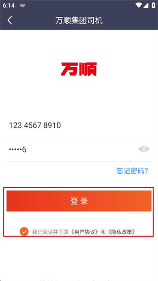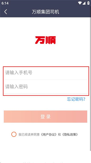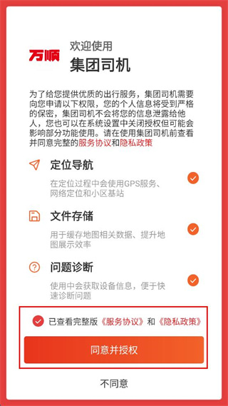 1、打开万顺集团司机端,勾选已查看完整版服务协议和隐私政策,点击同意并授权按钮。