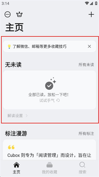Cubox,记录有效的文字信息,app采用极简的页面设计,功能布局贴合大众用户的使用习惯,能够带给用户非常舒适的使用感受;软件拥有多样化的信息采集、收纳、整理方式,能够为用户收集、存储很多碎片化的知识,便于用户时时查阅,提升了阅读效率。