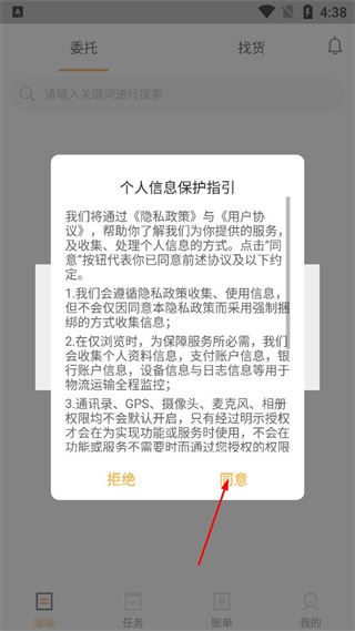 1、打开货运接单应用,阅读弹出的个人信息保护指引内容,点击同意按钮进入主界面。