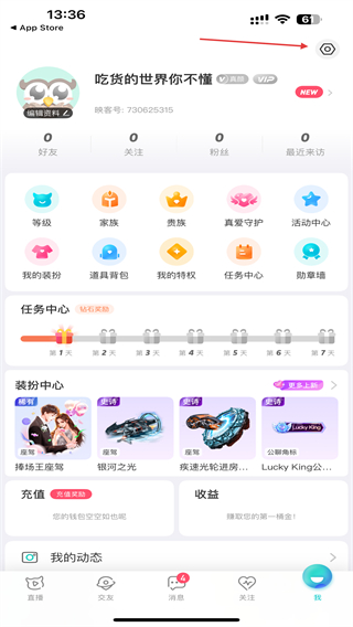 1、打开映客直播进入个人页面后,找到并点击右上角的设置图标,进入设置的界面。