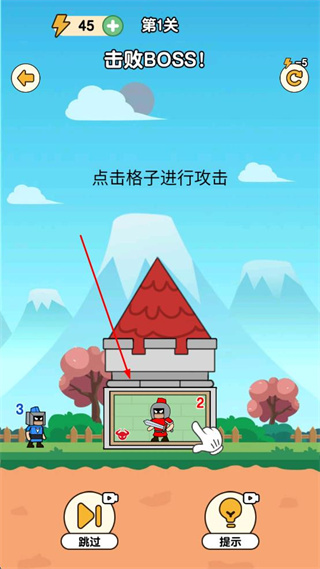 2、在第1关场景中,按照提示点击对应格子,对BOSS发起攻击完成关卡。