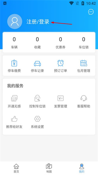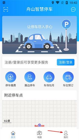 1、打开舟山智慧停车首页,找到底部导航栏的我的选项,点击进入对应的页面。