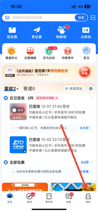 1、打开菜鸟APP,进入首页后点击全部包裹,位于查收板块下方,显示包裹总数,进入包裹记录列表页面。
