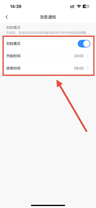 4、在消息通知页面,找到勿扰模式,即可设置勿扰模式功能。