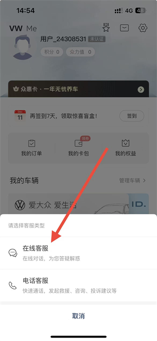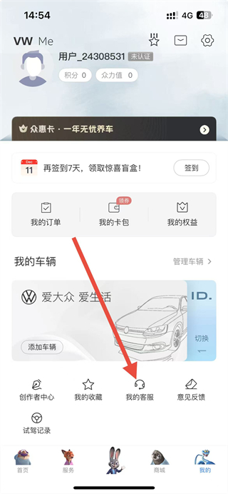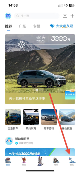 1、打开一汽大众app,在首页点击右下角我的选项,进入个人页面。