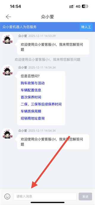 4、进入在线客服对话界面后,可在输入框中输入问题,发送给客服获取解答。