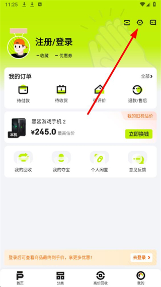 1、打开拍拍二手app,点击底部导航栏中的我的选项,点击页面右上角设置图标。