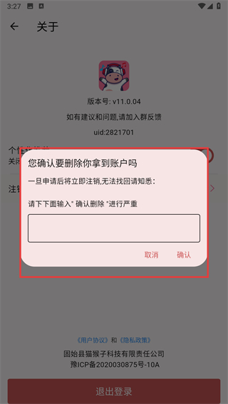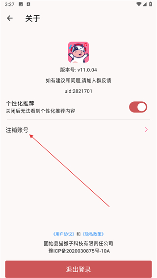 3、在设置页面中选择注销账号选项,弹出账号注销的确认提示框。