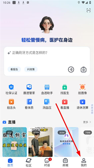 1、在老来健康应用底部,点击我的选项,进入个人中心页面。